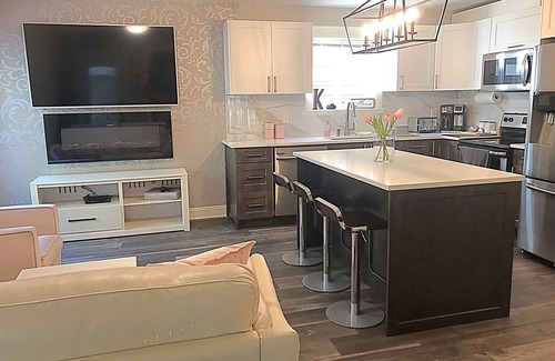 Situated in Bear Mountain - resort style living. Brand new BEAUTIFUL MODERN PARIS CHIC 1bedroom suite with quartz countertops in kitchen/bathroom, fireplace, 65 inch tv, chandelier in bedroom, brand new bathroom with new tile, faucets and tub. Private entrance and covered patio with patio furniture overlooking a relaxing greenbelt. Includes: hair dryer, dishes, pots, pans, cutlery, toaster, and coffee maker. Washer / dryer uses cold water wash. These accommodations suite 3 people, 2 in bedroom and one on couch. There is NO sofa bed. There are 4 steps to get into this suite of which 3 are on the walkway and one is the porch step (see photos).