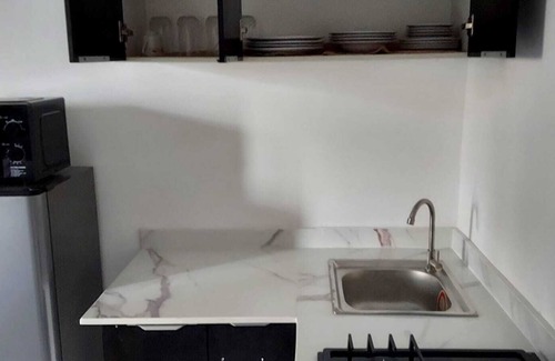 As you step into the apartment, you're greeted by an cozy living area that sets the tone for the entire apartment unit. The space is tastefully decorated with plush seating, a chic coffee table, a full kitchenet with plates and cutleries for your use and enjoyment, including and artful décor that exudes sophistication. Large windows allow natural light to flood the room, creating a warm and inviting atmosphere making it an ideal space for quite entertaining or enjoying quiet moments.