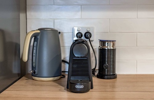 Separate kitchen with dining setting for 4 people off to the side. The kitchen has fridge, electric stove, Pod coffee machine, kettle, toaster and lots of bench space.