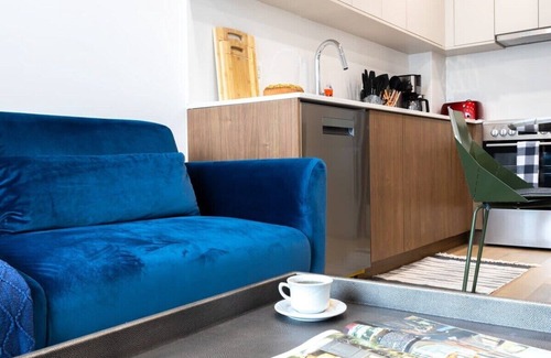Featuring a spacious and fun living area with a flat screen TV and sofa-bed, a dining table, and great closet space throughout the apartment, this space is perfect for unwinding after a long day exploring the city. The bedroom features a luxurious queen-size bed, and high-speed Wi-Fi is available throughout the apartment. Fresh linens, towels, and extra pillows are also provided.