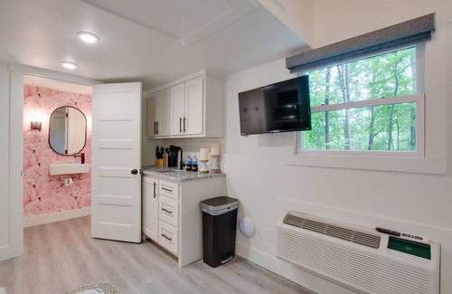Get ready to flamingle in our pint-sized Flamingo-flared Tiny Cottage! It's the perfect spot to escape and unwind, nestled on 40 acres near stunning Lake Guntersville, Alabama. Our boutique-style Tiny Cottages boast five unique stays, but the Pink Flamingo steals the show with a fabulous pink door painted with Sherwin Williams' "Pink Flamingo" paint. And that's not all - we've decked out the entire space with matching decor, and accented wallpaper making it the ultimate Insta-worthy retreat. So pack your bags and get ready for a fun-filled staycation or quick getaway.