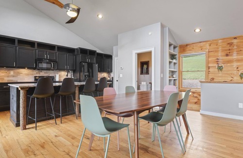 Living room with 65" smart tv, comfortable couches with mountain views, plenty of space to relax. The kitchen is stocked with essentials for your trip and features a massive granite island with rustic touches. First floor primary suite for those who may not want to go down stairs. The patio/fire pit area is picturesque and a great spot to wind down in the evening. Everything you need for a great trip to the mountains!