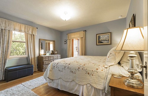 1940 Lake Cabin with stunning views of the Flathead Lake and Mission Mountains. This is our very special home that has been enjoyed by the family for years. The house was one of the original homesteads in the Somers area. Gorgeous river rock fireplace. Lake facing windows in the living room, master bedroom, upstairs loft. Closed in porch. There are two bedrooms on the main floor and a loft with knotty pine walls that has a full sized futon converted to a bed (not practical for an adult). The master bedroom has a king sized bed, and the 2nd bedroom has a queen sized bed. There is one full bathroom in the house and a bathroom (toilet, sink, and shower) in the unfinished basement. Vintage kitchen with a knotty pine wall, original hard wood floors, and cork floor in the kitchen. There is about a hundred feet of private lake frontage and a nice sized yard with a new deck that is accessible from the living room. There is a dock with a boat slip and several places to rent a boat from in the area. Unfortunately there is no where to park a boat trailer and so bringing your own boat would not be feasible unless you have arranged your own trailer storage elsewhere.