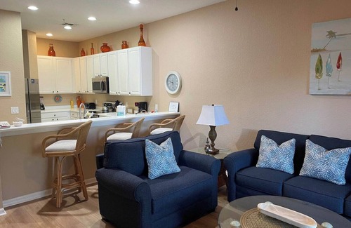 Our updated Caribbean-style villa is in a gated community with 24-hour security only15 minutes from Disney World. It is a handicap-accessible ground-floor unit in a great location. It is the closest unit to Tradewinds restaurant, bar, large pool, hot tubs, white sand beach and fishing dock on Lake Davenport. It is a two-bedroom / two-bath,1395 sq. ft villa. Wood laminate floors grace the living, dining, and bedrooms. The large, fully equipped kitchen, bathrooms, and laundry room have ceramic tile. The large bedroom has a king-size bed, flat-screen TV, ceiling fan, and a walk-in closet. The ensuite bathroom has a large soaking tub, double sink vanity, and handicapped (Roman style) walk-in shower. The 2nd bedroom has 2 twin beds, a ceiling fan, a flat screen tv, and a closet with plenty of storage for your things with private access to the main guest bathroom. The living room has a sleeper sofa, chair, and a 55-inch smart tv. It extends to a large screened-in lanai. There is seating for 6 on the lanai or in the spacious dining room for all your meals.
