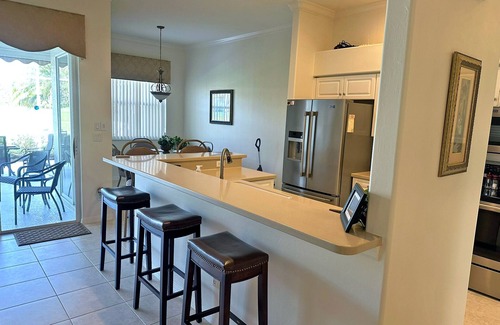 This inviting 2-bedroom rental villa in Heritage Palms Golf and Country Club, located in Fort Myers, Florida, offers a relaxing retreat with all the comforts of home. The villa features an open-concept living space, with two bedrooms and a den in between, a fully equipped kitchen, and two dining spaces. Large windows let in plenty of natural light, creating a bright and airy atmosphere. Step outside onto the private lanai – from either the living room or main bedroom - to enjoy peaceful views of the lush landscaping and well-maintained surroundings of hole 11 on the Sabal Course.