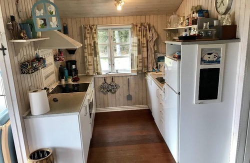 There is a wood stove and panoramic windows facing the garden, and here you can sit on the sofa and "feel in unison with the green outside". The kitchen is open to the living room and has a dishwasher.