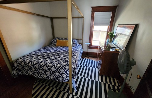 Unwind and relax in this charming 1920s first floor apartment adorned with original details like the clawfoot bathtub and original woodwork. 2 separate bedrooms with queen beds and dressers provide ample places to rest your head. A large front porch provides a shaded area to sit and enjoy the nice weather.