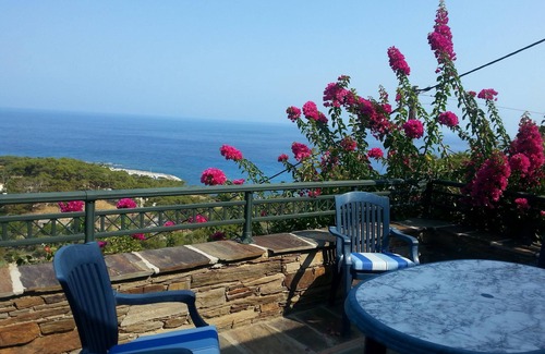 Independent accommodation on the Greek island of Ikaria, longevity island: 2 bedrooms / 4 people, upstairs of 1 character villa with bathroom, fitted kitchen, mosquito nets, terrace, breathtaking view. Possibility of 1 additional bedroom / 2pers, with bathroom adjoining the ground floor. Comfortable studio, in a quiet, flowered, shaded environment, with many fruit trees. 900m from the beautiful sandy beach of Messarti (surf school). Access on foot in 10mn by footpath in the center of the village of Gialiskari, where we find the port, shops and taverns, pharmacy, bakery, bus, car / motorbike rental etc.