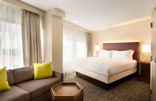 Booking the adjoining 1 King Bed 1 Bedroom Suite + 2 Queen 1 Bedroom Suite gives groups a combined four rooms and 1,100 square feet of space to spread out. Enjoy subtle southwestern surroundings throughout and living rooms that feature dining tables and wet bars with mini-fridges and microwaves. After a day of fun, groups can spread out and grab some sleep on a King bed, two Queen beds and two sofabeds. Freshen up in upscale bathrooms decorated with deep desert tones and granite vanities. These adjoining accommodations are ideal for visitors seeking connecting suites in Phoenix. Located in the city's Central Corridor, the newly renovated hotel offers an ideal location for business or pleasure in the Valley of the Sun. After savoring a complimentary made-to-order breakfast, hop on the adjacent light-rail train for easy access to the Phoenix Convention Center, Chase Field, Talking Stick Resort Arena, Arizona State's downtown campus, and more. Unwind from a delightful day with free beverages and snacks at the Evening Reception inside the elegantly decorated atrium. Then get your fill of Phoenix-inspired fare at the Salt River Tavern, which features a water wall and hues that reflect the desert at dusk. Finally, wrap up the day with a dip in the heated pool or a workout at the fitness center.