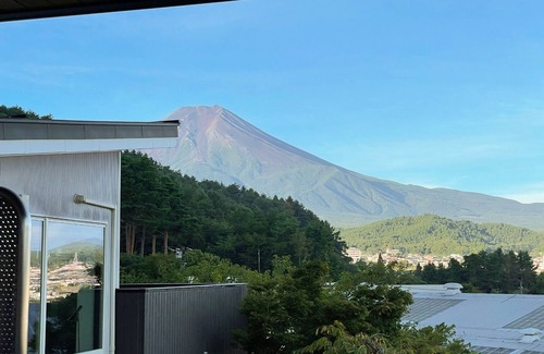 Balcony with a view of Mt Fuji and a view bus with a view of the Fujiyoshida cityscape