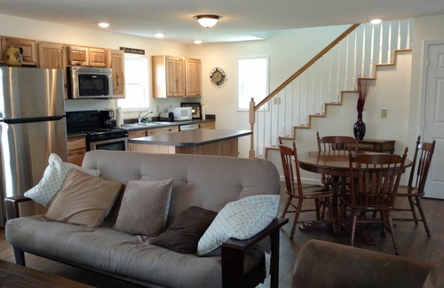 The home boasts over 1,250 square feet of space including 3 bedrooms, 2 and 1/2 bathrooms, and an eat in kitchen. The Master Bedroom has a King size bed and includes a private bathroom which includes a shower. Two other bedrooms upstairs offer Queen Size Beds and share the second bathroom with shower. The Living Room includes ample seating for 8, and a 50" HD television. The third 1/2 bathroom is located off of the Living Room. The futon in the living area allows for additional sleeping space if needed. The Eat-In Kitchen seats 8, and has new stainless steel appliances includes seating for 6 at the table and 2 at the breakfast bar. Free wireless internet service is available.