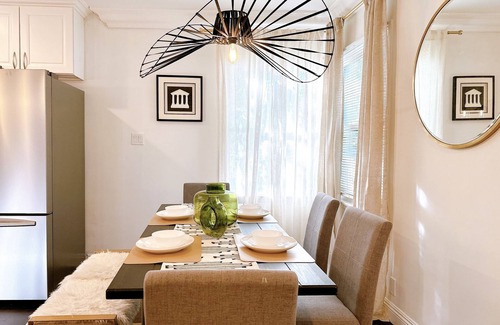 Unwind in the cozy living room adorned with sofas, poufs, and a 65'' flat screen TV. The fully equipped kitchen boasts stainless steel appliances, ample counter space, and a chic bar area with stools. Gather at the delightful dining table for 6 plus bar area for 3 more. Two more LCD TVs in other bedrooms.