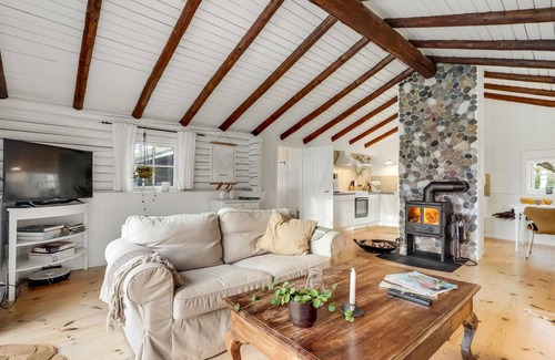 This charming wooden house welcomes you to Helligsø Strand. It is ideal for travelling together with your family. In addition to the main house, there is another bedroom in the outbuilding. The bright and open living room, which has a warming wood-burning stove in the middle, invites you to watch films together, play games or get cooking.