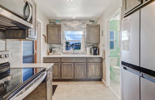 *Beautifully remodeled kitchen furnished with stove, refrigerator, microwave, Keurig coffee maker, pots, pans, small appliances, dishes, glassware, and silverware