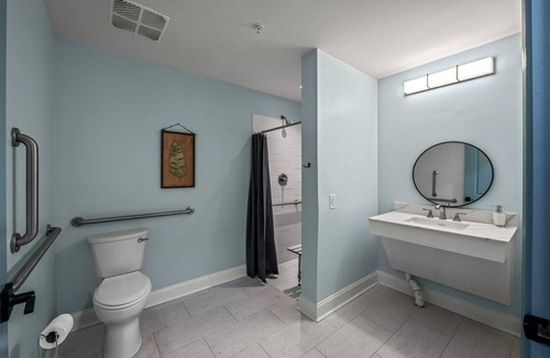 The bathroom combines elegance with convenience, featuring a sleek shower and modern fixtures.