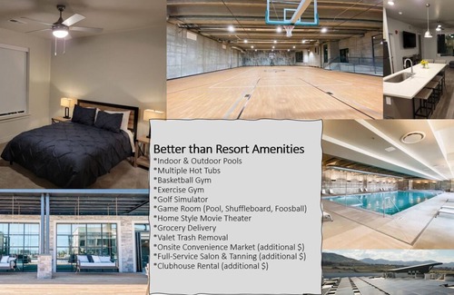 Dual master 2 bdrm, 2.5 bath with BETTER than resort style amenities which include multiple hot tubs, outdoor AND indoor pools, full size basketball court, workout gym, onsite salon, onsite market. Solar powered suites w/battery backup. Perfect for a business trip w/the family, a weekend getaway, or staycation. Convenient to Silicon Slopes and a straight shot down Bangerter Highway from the SLC Airport.