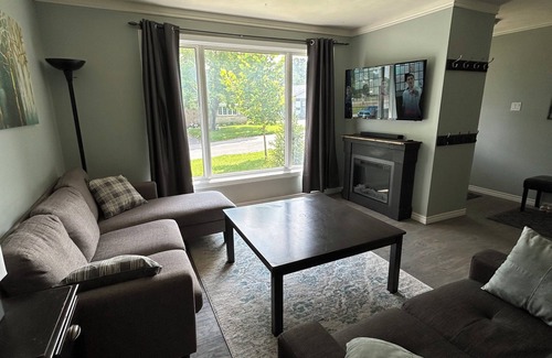 This bungalow in Peterborough offers a soothing retreat for guests with 4 bedrooms - 2 king beds and 2 queen beds. The property features 2 bathrooms with a shower, bathtub, and hair dryer. Enjoyable amenities include a fully equipped kitchen, bbq, games room with darts and ping pong , indoor theatre, outdoor putting green, iron, hair dryer, washing machine, AC, heating, and WiFi are provided for your convenience. Our place is equipped for both long or short stays to make your stay away from home one to remember.