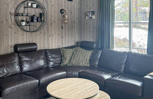 Experience relaxing days in the middle of vast forests and enjoy the tranquillity of this special environment. Your cosy holiday home near Solhomfjell is the ideal base for active excursions and relaxing hours by the fire. Make yourself comfortable in the open-plan living area. Relax in the large sofa area or enjoy your meals at the long dining table with a view of the natural surroundings. The wood-burning stove provides cosy warmth, while the open-plan kitchen invites you to cook together. Large windows let in plenty of light and bring the outside in.