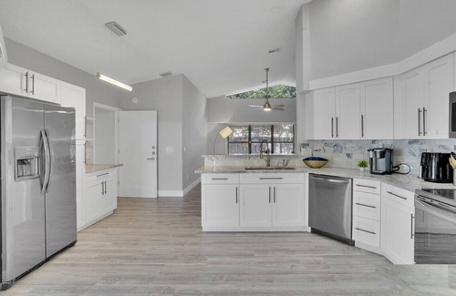 Discover Bright and spacious (over 2,200 sq ft) beautifully furnished 4/2 with Heated Pool home available in sought after Sugar Pond in Wellington! Just a short golf cart ride to WEF, close to Starbucks, Dunkin, brand new Publix and multiple restaurants and shopping within a mile. Relaxing Pool & Spacious Outdoor area with screened patio - Perfect for unwinding after a long day! Fully remodeled with gorgeous fully stocked kitchen, 4 good sized bedrooms with a split floor plan for privacy, crisp quality cotton linens. 2 car garage and large driveway. Enjoy amenities like WiFi, AC, heating, and a washing & dryer. It's easy to see why you'll be able to unwind at our place!