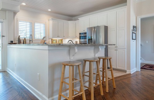 Carolina Elegance North is a two-story spacious home with garage access. The first floor offers a generous living area with plush seating, dining space, and a large HDTV. Step onto the screened porch/sunroom for lounging, reading, or morning coffee. The well-appointed kitchen with granite countertops and a pass-through to the dining room makes morning coffee with a marsh view a delight. The laundry room is located on the first floor along with a half bath. A king bedroom overlooking the pool and marsh with a full bath completes this level.