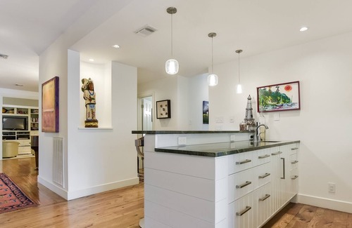 Escape to this sanctuary, only 5 minutes to Downtown Austin, which also happens to be a sanctuary for wildlife as it is a certified natural habitat for local plant and wildlife. Natural beauty is combined with luxury. Floor to ceiling windows provide a beautiful backdrop to your activities in a music room - complete with vinyl, CDs and even cassettes from yesteryear- to a cool break room upstairs. The beautiful built-in bar is a great place to mix your evening cocktail. Enjoy the pool, outdoor kitchen/living, ping pong table, and dining areas as well as a second-floor lounge area with fireplace where you can watch the stars. Catch the game from the outdoor TV room overlooking the pool and spa. Meditate next to the incredibly Zen koi pond.
