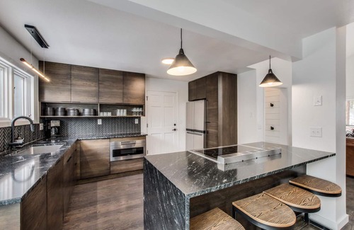 This is the perfect home for large groups with enough private space for everyone. There are five bathrooms, five bedrooms with king beds, and a bunk room with six twin beds. There are three living areas to spread out: a large great room; a TV loft with sectional; a family room with wood stove, pool/ping pong table, and kitchenette. The kitchen is fully stocked to prep a big meal where you can share at the large dining room table.