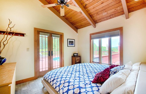 The pool, which is open during the summer, is surrounded by a large deck and offers outstanding views of the surrounding valleys and hills. An outdoor gas BBQ is available for your group’s grill master. The lanai (small white building) has a fireplace and huge windows and is perfect for relaxing after a fun day of skiing, hiking, golfing, and adventure. The estate also has an outdoor firepit.