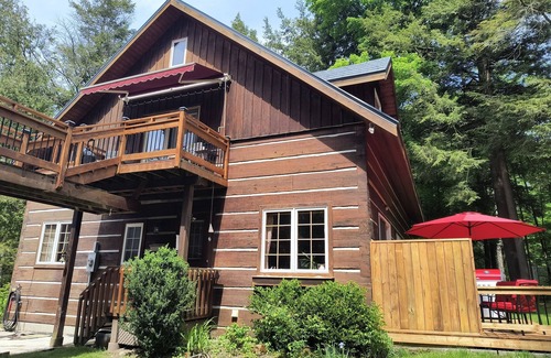 This charming log home is nestled in a mature wooded lot, next to a picturesque, babbling creek. True serenity, with ample space for relaxed backyard lounging, outdoor barbeques and plenty of play area for the kids.