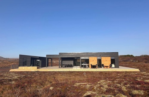 Unique and luxurious lodge in South Iceland, perfectly located in the Golden Circle, within an hour drive from Reykjavik. The modern house is equipped with 4 bedrooms (3 + 1 in the guesthouse), 2 bathrooms (1 +1), fully equipped kitchen, dining area, living room and a large private terrace with mountain views. There is an outdoor seating/dining area, barbecue and a hot tub. Amenities such as Smart TV, floor heating, a washing machine/tumble dryer. Bedlinen, towels, and bathrobes are provided.