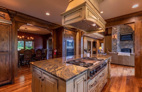 The kitchen is any passionate cook's dream. It's outfitted with custom cabinets, yards of granite counters including a huge island with a gas stovetop, and stainless steel appliances. Two can eat at the stools at the island, but don't worry – there's room for up to 10 at the table through the archway off the kitchen. Also off the kitchen is a laundry room with soaking sink, and a little office space with desk for those who just can't fully tear themselves away from the office. The half bath is conveniently on the main floor near the garage entrance.