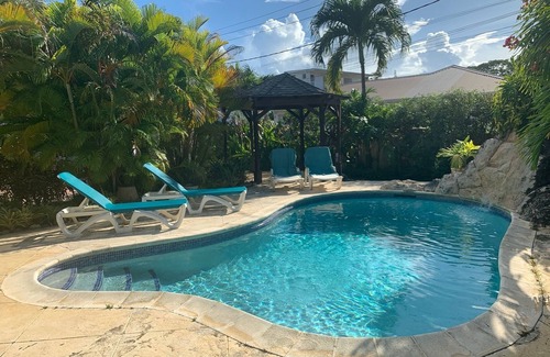 This is a lovely ONE BEDROOM self contained ground floor apartment in a 2 storey villa 200 metres from Mullins Beach. It is spacious with a well furnished open plan living room with very comfortable seating, TV, Wi-Fi. The dining area has a large dining table and seating for up to 6 persons. A large well equipped kitchen. Ceiling fans throughout, air conditioned bedroom, bathroom with bath tub inclusive and shower room. A book cabinet containing a collection of books, holiday brochures and an on going folder created by our guests over the years and full of invaluable tips and information about island tours & sites, restaurants, shopping.