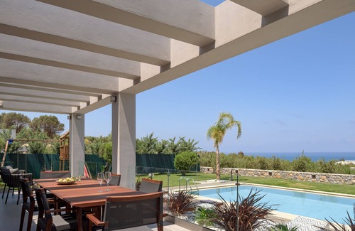 As spectacular design-led villa with Private Pool, Two Seater - Heated Spa Whirlpool, Children’s pool compartment and iconic surroundings.
