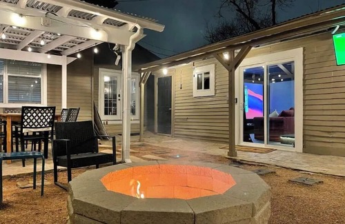For those cool nights, we have an in-ground heated pool, which is set to 90 degrees during the cool weather. You can unwind in our backyard oasis with two seating areas which includes 2 fire pits. You an gather around the wood burning fire pit and roast marshmallows, or sit around the propane fire pit while you enjoy watching you favorite show or game on the large smart TV. Our barrel-style charcoal BBQ grill is perfect for cooking up some Texas-style barbecue and enjoying a meal al fresco. And with night-time lighting and a privacy fence, you can relax and enjoy the backyard well into the evening.