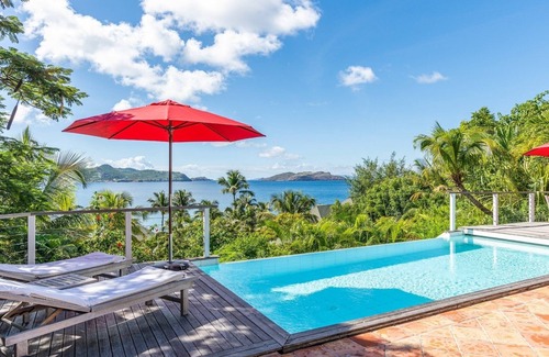 Built in a Caribbean style, this magnificent vacation villa in St. Barthelemy is composed of a comfortable and spacious living room in contemporary decor. The adjoining dining room accommodates four people facing a view over the swimming pool and the ocean. You‘ll enjoy cooking meals in the lovely kitchen well equipped with all the best appliances.