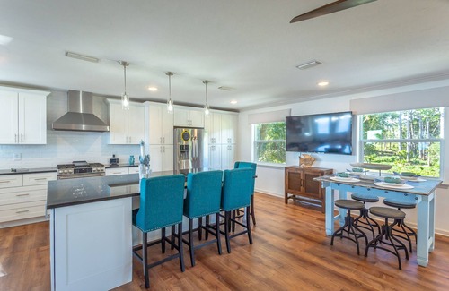 The Allure itself is a 4-bedroom, 2-bathroom home located directly on the bay, offering expansive bay views overlooking Dog and Bird Islands. It has a large private dock that provides even more spectacular views. Guests can watch dolphins swimming regularly during low tide, observe blue herons on the sand, and see pelicans gracefully flying over and congregating on area docks. The Tallahassee International Airport is conveniently located less than an hour away.