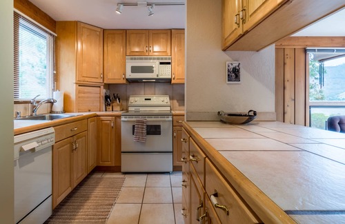 Expansive picture windows with impressive lakefront views beautifully compliment cabin decor and plush furnishings in the classic A-frame design of this home. With three window air-conditioning units in this home, you can cool off between all your water-themed adventures in the spacious living area, where you'll find comfortable couches for taking a nap or lounging with your group on movie night as the room's TV features a DVD player. This home also offers free WiFi to help you keep in touch with friends and family back home.