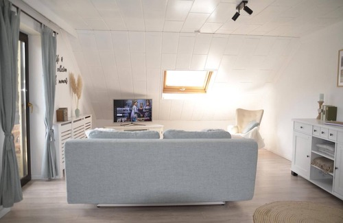 Overlooking the mountain, the holiday apartment Ferienwohnung Brehm near Bad Staffelstein impresses guests with its fantastic views. The 88 m² property consists of a living room with a sofa bed for 2 people, a kitchen, 2 bedrooms and 1 bathroom as well as an additional toilet and can therefore accommodate 5 people. Additional amenities include Wi-Fi, a smart TV with streaming services as well as a fan. A baby cot is also available. This vacation rental features a private balcony for your evening relaxation.