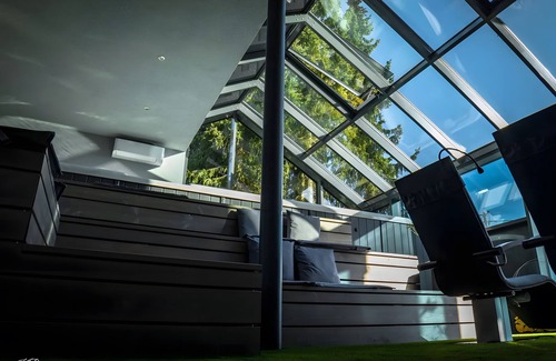 - Living room with 180-degree panoramic view of the Alps