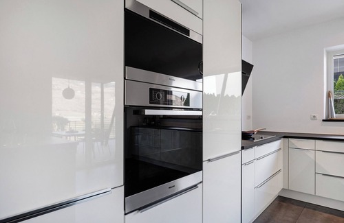 The 103 m² accommodation for 4 people consists of 2 bedrooms, 2 bathrooms, a spacious living-dining room, and a well-equipped kitchen with a dishwasher. Additional amenities include high-speed Wi-Fi (suitable for video calls) with a dedicated workspace for home office, a TV, air conditioning, a washing machine, and a dryer. A baby cot and high chair are also available. In the private garden with a covered terrace, you can relax in the evening and enjoy the fantastic view. The building housing the accommodation features a barrier-free interior and an elevator.