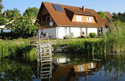The comfortably furnished apartment is located on the upper floor of a residential building on a lake plot on Wanzkaer See. The beach is about 100 meters away. It has a separate entrance and lake view.The apartment is equipped with a combined living / dining room (upholstered seating area, dining area, LED TV, radio), a bedroom (double bed), a walk-through room to the balcony with sitting area, a kitchenette with electric stove and microwave, a bathroom / WC with shower and bath as well as central heating. Washing machine use by appointment possible. The owner gives a small fee, a rowboat and a kayak. Breakfast (5 EUR) and bread service are also possible on request. At disposal are bicycle storage room, grill and car parking space. The total price includes water and energy consumption, final cleaning. Sheets and towels can be brought or rented (DHW 5 EUR / package, towels. 2, EUR / package). Smoking is allowed outdoors only.