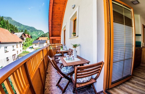 Apartments BBI are in the centre of village Luče, in the immediate vicinity of restaurants, bars and shops. Built in 2017, they are located on the 2nd floor of a business residential building. From the common hallway, soundproofed security entrance doors lead to the apartments where guests will enjoy privacy and comfort. All apartments are equipped with solid wooden doors, high-quality solid wooden furniture, functional daytime equipment, high-quality beds for good night’s sleep, modern appliances for nutritious and delicious food preparation, and other functional accessories