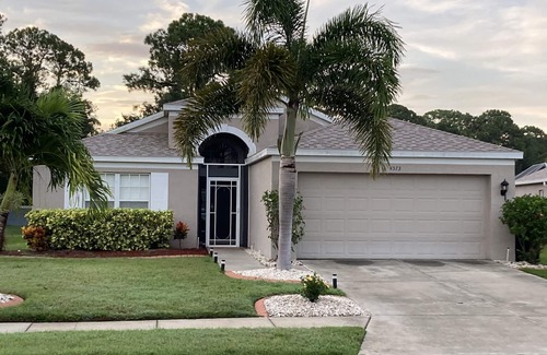 Beautiful pool home with lakeside view, vaulted-screened lanai, BBQ and heated pool/hot tub. Relax in an open-concept, single-story house with 4 TVs, unlimited WiFi, 4 bedrooms, and multiple sleeping options. A short stroll from the community clubhouse with pool, tennis, basketball courts, children's play structure, and lush grounds and walkways. Close to local markets, restaurants, golfing, and public library, with plenty of shopping nearby. Right near the Braden River and just south of Tampa Bay and the Manatee River, this house is centrally located near IMG, Ringling Museum, Palma Sola Bay and Sarasota Bay. Bradenton beach is 12 miles away, and other popular Florida beaches – from Siesta Key, to Longboat Key, to Anna Maria Island – are also between 12-18 miles (20-30 minutes) away!