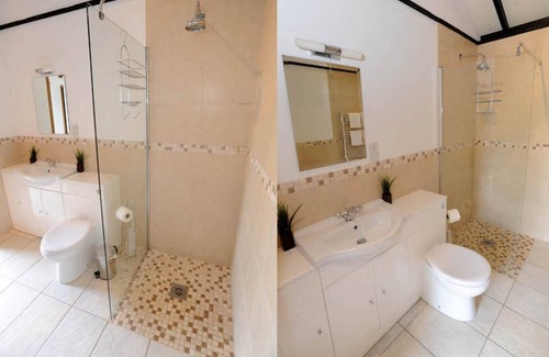 The stylish wet room boasts a walk in shower, heated towel rail, toilet, basin, tiled floor and underfloor heating.
