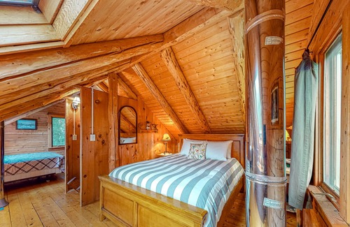 At home, the fun only continues! Utilize the provided canoe to get on the water, or fire up the gas grill for a delicious summer barbecue. Inside, get comfortable as you play a board game or two. When hunger hits, utilize the cabin's rustic, cozy kitchen with its fridge, microwave, and stove. As the sun begins to set over the trees, head back outside and gaze up at the dazzling night sky. Sleep will come effortlessly as you nestle under the plush quilts in the bedrooms.