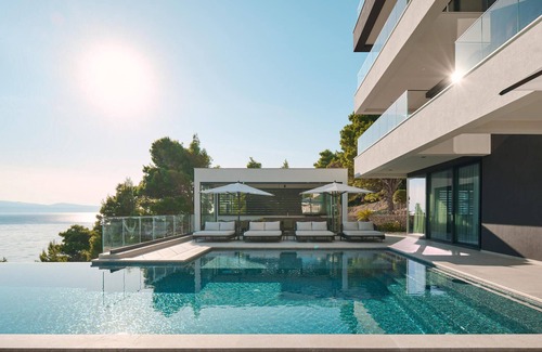 The luxury villa Alanis is located in the small town of Mimice, just 20 kilometres from the town of Omi. Every year Omi is visited by many tourists looking for relaxation and a luxurious holiday. If you are one of them, do not miss the opportunity to spend a pleasant time with family and friends, only 20 metres from the sparkling and clean Adriatic Sea. Villa Alanis is special in many ways and what sets it apart from all others is its incredible maximum accommodation capacity of up to 16 people and its beautiful indoor pool! Furthermore, it was built in 2023 and the optimal number of people is 16. Guests are comfortably accommodated in 8 bedrooms: 6 double beds (200 x 205) and 4 single beds. The rooms also have a balcony from which you can enjoy the view of the unspoilt nature and the sea. The villa also has 8 en-suite bathrooms with showers. Of the 8 bedrooms mentioned, 6 rooms together with a bathroom have 40 m2 and the remaining 2 bedrooms have 30 m2, each with a bathroom. This modern villa is ideal for a larger group of guests looking for 800 m2 of living space, while the total area of the property is 1100 m2. The nearest pebble beach is 20 metres from the villa and there are restaurants, cafés and shops nearby. Another special feature of the villa is that you can enjoy the sea view from all rooms. A luxurious atmosphere and the opportunity to relax body and soul are offered by the sauna, wellness room and fitness room, where you will feel like a king! On the ground floor there is a living room furnished to the highest standard: beautiful corner furniture, 3 stools, a coffee table and a TV where you can watch your favourite films and series with your family and friends. Of course, there is also a spacious dining room with a table for 18 people and 2 wine fridges next to it. The modern kitchen has everything you need to prepare delicious meals, including two bars and three bar stools. At Villa Alanis, you can choose whether you want to swim in the outdoor or indoor pool. The indoor pool is located in a separate room, next to which there is a seating and lounging sofa for relaxing and reading books. On the outdoor terrace with sea views, you can refresh yourself in the heated pool of 96 m2 with a depth of 1.4 metres. On the sunbathing area next to the pool there are 12 sun loungers, garden furniture for sitting and drinking your morning coffee, as well as two parasols and two outdoor showers. On the covered part of the terrace there is also an outdoor dining table, a small summer kitchen and an electric barbecue. Villa Alanis has additional facilities that will be of great use to you during your stay, namely a washing machine, tumble dryer and iron, and there is also 1 separate toilet. The villa also has underfloor heating/cooling and if children are coming on holiday, there is a feeding trough and a cot. There is a sofa bed in 6 of the bedrooms, which serves as an additional sleeping option. Animal lovers will be thrilled and delighted that 1 pet is allowed in this villa. The villa has up to 15 parking spaces in the fenced yard and also has a charging station for an electric car. Enjoy the excellent gastronomic offer of traditional Dalmatian dishes, taste delicious drops of wine and relax in the sun. Drive to the town of Omi or Split, take a walk along the Split coast and visit historical sites that are visited by a large number of tourists every year. There is also Makarska, which is very similar to ibenik or Trogir, and the interesting sights of the old town are squares and buildings from the Renaissance and Baroque periods. One of the most beautiful places in Makarska is St Mark's Square. There is also the waterfront promenade where you can stroll and visit various cafés and restaurants as well as the town museum. It is also worth visiting the town of Brela, which has a 6 km long pebble beach and landscaped promenades and is the perfect destination for a quiet family holiday. Mount Biokovo is located above Brela and from its highest peak (St Jure) you have a spectacular view of the entire Makarska Riviera. Dive into the depths of the clear Adriatic Sea, explore the coast and small fishing villages and take the memory of a perfect holiday with you! Welcome to Villa Alanis! Pets are allowed in this accommodation at the owner's discretion or for a fee.
