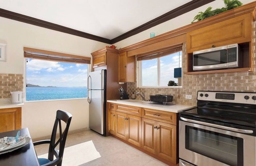 Part of a 7 bedroom villa Barracuda is perched on the second floor, with sweeping views of the Caribbean Sea, Sandy Point Beach, the pool deck, mini-golf course, and gazebo. Whether enjoying the scenery from the private balcony or through the suite’s expansive windows, every moment feels like a postcard. This elongated one-bedroom unit features a king bed with an en-suite bathroom, a 42” smart TV, a fully equipped kitchen, and an open-concept dining and living area perfect for entertaining.