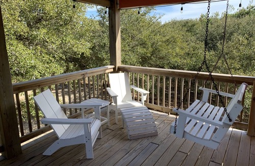 Outside on the large covered deck is a swing and lounge area on one side with a table and charcoal grill on the other. On the ground level there is an outdoor shower and a comfy hammock to relax in. There is a storage room with an additional half bathroom and washer and dryer. To complete the outside and guaranteed to be a hit with the kids is a tree house, swing, and a zip line to stay busy for hours when you're not at the beach!