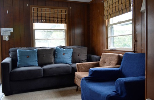 The living room has a couch, 2 chairs, table, TV stand, and lamps. A desktop table and chair are available for remote work. Large flat screen TV with cable and Blu-Ray DVD. Private Wi-Fi network. Bedroom has 2 closets, dresser, bureau, and full bed. Kitchen furnished with bistro table, 2 chairs, 2 burner stove top, convection oven, microwave, refrigerator/freezer, coffee maker, toaster, blender, basic kitchen utensils, pots and pans, dishes, and tableware. Air conditioning, plus ceiling fans, in living room and bedroom. Bath has shower, sink, mirror, medicine cabinet, storage shelving, and toilet.