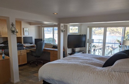 Waterfront entire home with a cabin like feel, commercial style kitchen, large deck with 2 styles of bbq (smoker/reg) , 3 bdr's , washer/dryer, Tv, Internet, workstation complete with printers, office supplies etc, Hot-tub with large deck, Paddle boards. Use of 13.5' boston whaler for additional cost and availability. Also available depending on availability is a yacht day cruise on a 60' Carver with crew including personal chef, bartender, captain. Ask for cost/details. This home is close to shopping, restaurants and walking trails and has incredible views !!! Use of paddleboards are included.