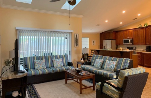This property is on a nicely manicured street, lined with tall Palm trees and across from the ocean. It is a clean and welcoming family home in a private community with a sparkling pool and spacious patio that enjoys prevailing ocean breeze. The split floor plan allows you privacy with 3 Bdrm, 2 Bth, and 2 car garage. The master bedroom has a cloud comfy king suite with fine linens and solid wood furnishings. Recently renovation Master bath has an updated walk-in shower, wood cabinets, granite countertop, double sinks, a private toilet, large walk-in closet, and linen closet. The other 2 spacious bedrooms are fully furnished, nicely decorated, and comfortably sleep 4. An additional roll-away bed is available. Both rooms share the other renovated spacious bath with access to the pool. The kitchen is roomy with 42” solid wood cabinets, stainless steel appliances, granite counters, fully equipped with dishes, cookware, flatware, coffee maker, toaster, blender, etc.. The spacious living room overlooks the pool and comfortably seats 8 with cable TV, and free Wi-Fi. The pool deck is furnished with seating and a lounger. Bed linens, bath towels, and beach towels are provided. Beach chairs are in the garage for your convenience. Please brush off sand on your return from the beach. Upon arrival, an initial supply of coffee, tea, cream, sugar, paper products, and toiletries is provided. Shopping for additional supplies is just a 5 mins drive north, and 2 mins south of the property. Great restaurants, drugstores, churches, and golf courses are nearby. Port Canaveral Cruise terminal is just 25 mins away, and Disney attractions are 90 mins West. You will love your VACATION HOME!!